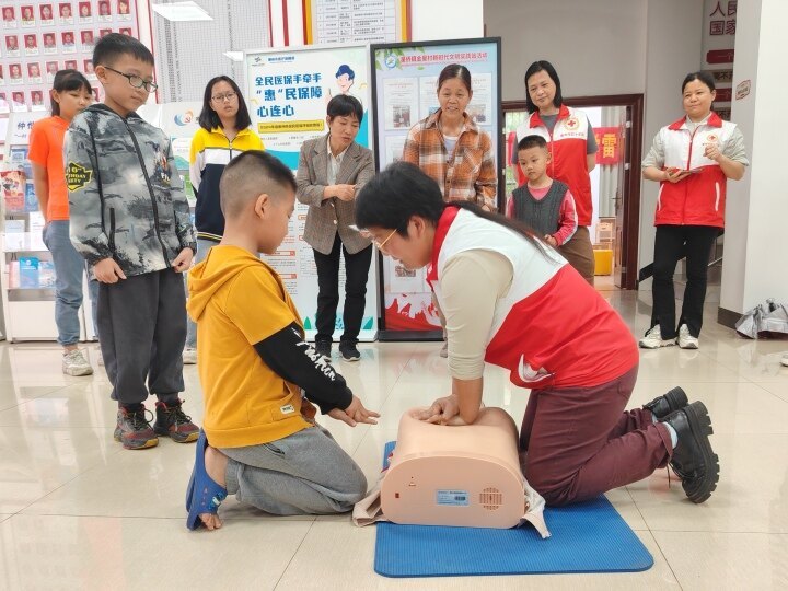 在心肺复苏环节,当讲师用模拟人示范胸外按压时,大家围成圆圈,自发跟着节奏数着:“01、02、03……”随着按压示范结束,人群爆发出一阵阵掌声。孩子们也跟着讲师体验按压,虽然动作稍缓,却格外认真。